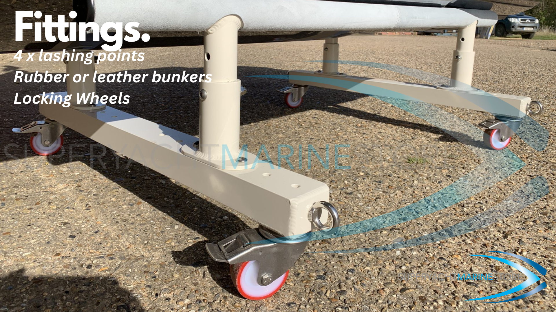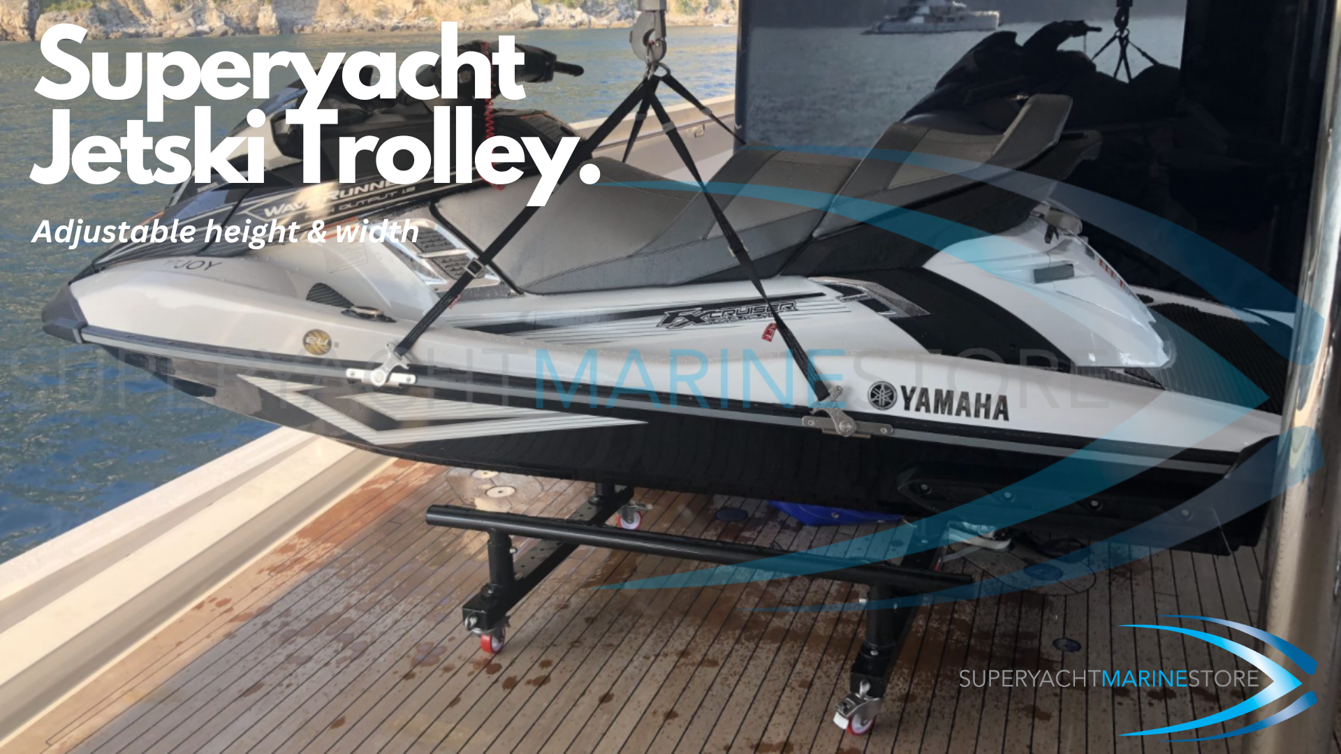 Superyacht quality high end jetski trolley built in the UK. Uniquely adjustable in both height and width it fits a wide range of craft. Widely regarded as the superyacht jetski trolley of choice as it offers safe, secure and good looking storage for jetskis. Reinforced so it can withstand the heaviest jetski's on the market.